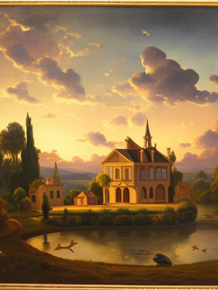 A Painting Of A Gothic Villa In A Landscape At Dusk With Fish In The Sky